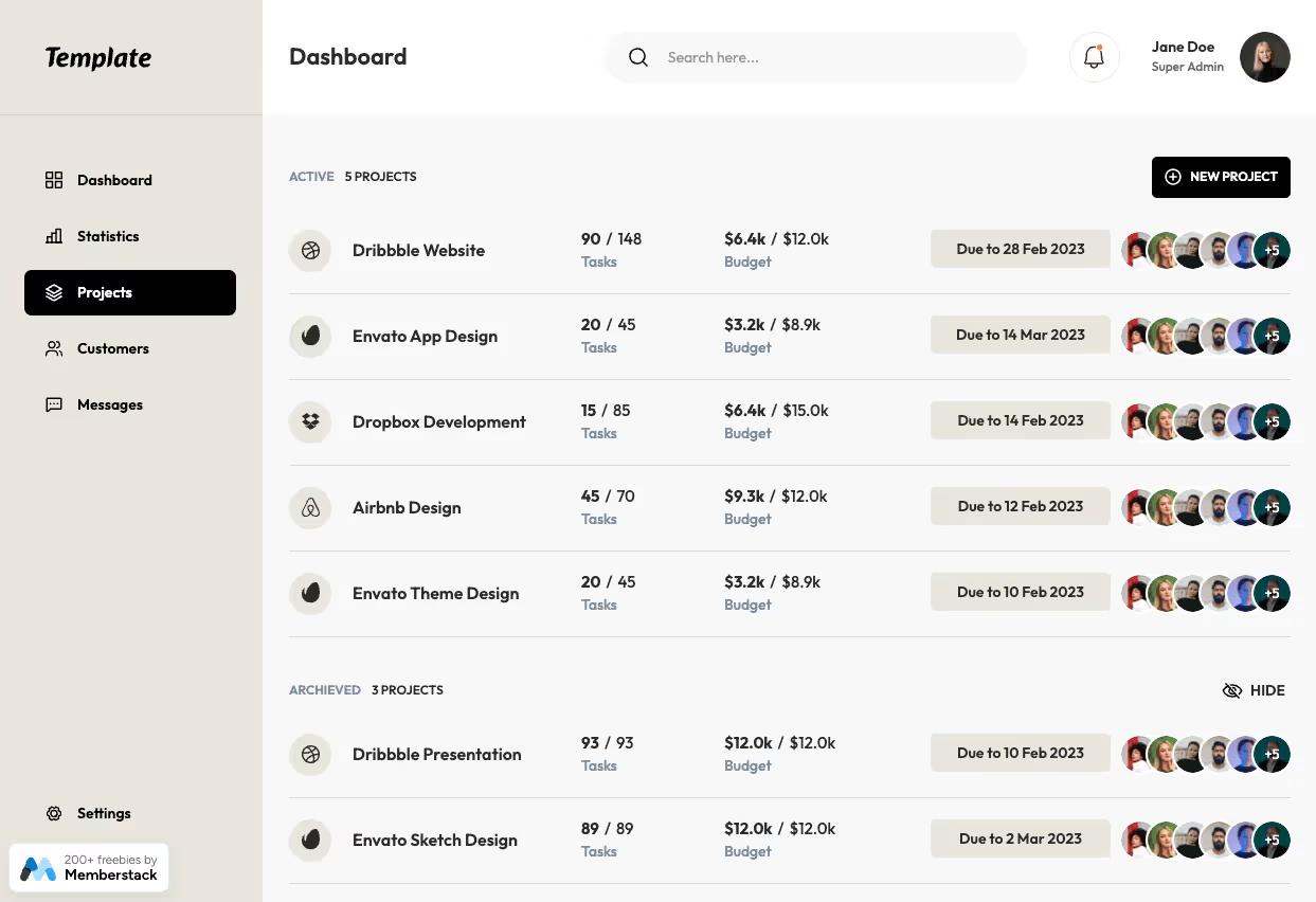 A free cloneable project management dashboard layout built in Webflow + Memberstack, designed to facilitate project tracking and management.
