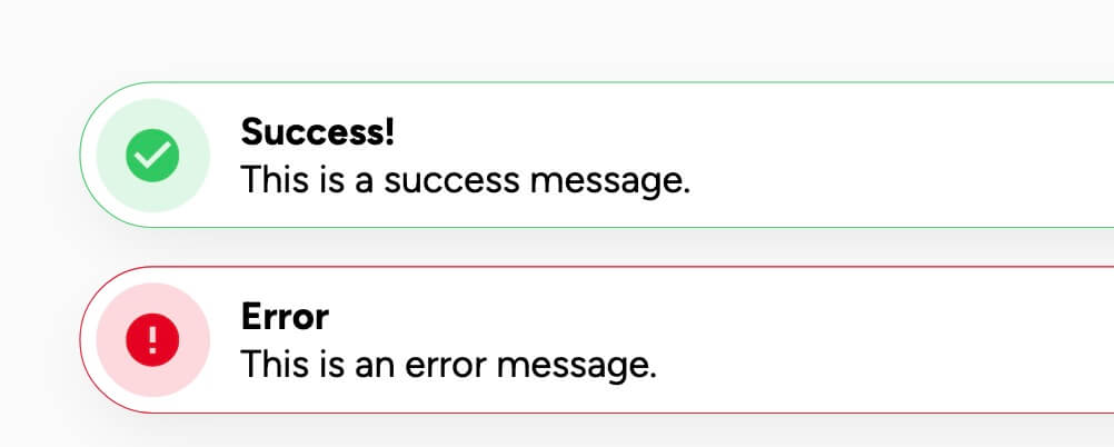 The Error and Success Boxes component provides a visually appealing way to display feedback messages to users, indicating success or error states in a web application. Key Features Customizable success and error messages Includes icons for visual representation Responsive design suitable for various screen sizes Fixed position for consistent visibility Easy to integrate with forms and user interactions Design Elements Clean and modern aesthetic Color-coded borders for success (green) and error (red) messages Rounded corners and shadow effects for depth Flexbox layout for easy alignment of content Potential Use Cases Web applications requiring user feedback on form submissionsE-commerce sites to confirm order success or notify of errors Content management systems for alerting users of status changes Customer support portals for displaying ticket status updates Conclusion: The Error and Success Boxes component is versatile and user-friendly, making it an essential tool for enhancing user experience through clear feedback mechanisms.