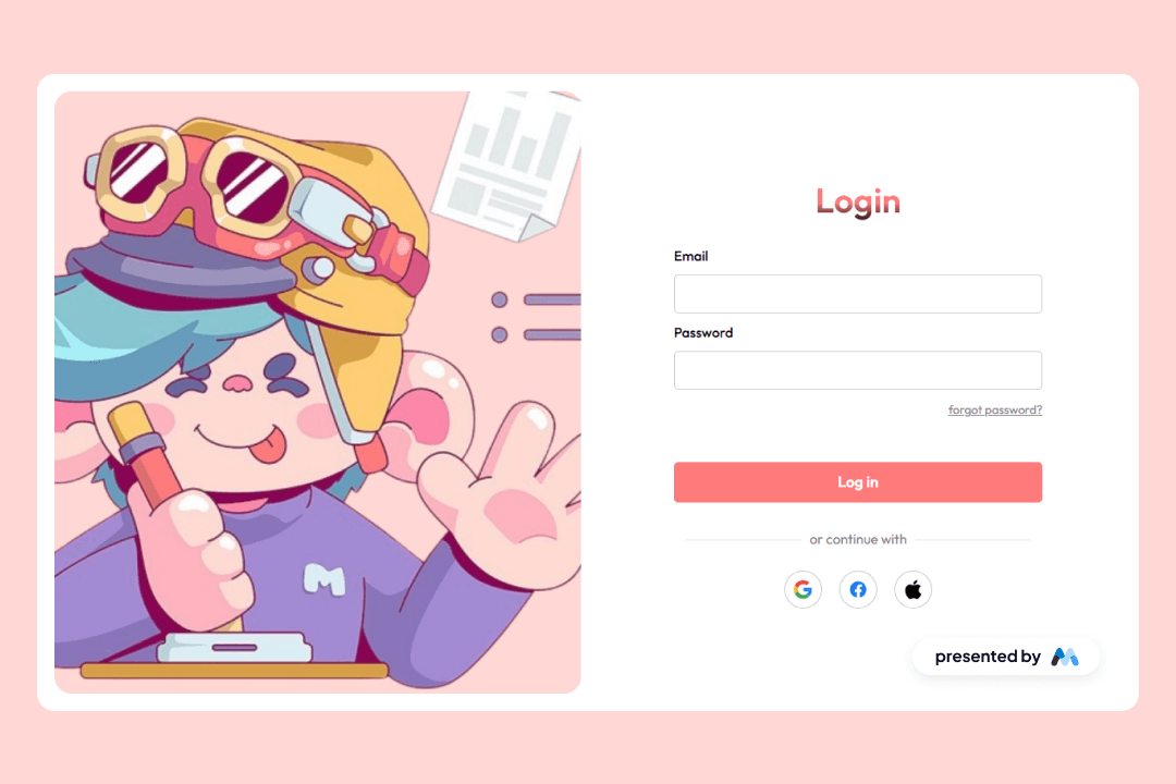 • Includes input fields for email and password with labels for clarity.Social media login options for Google, Facebook, and Git