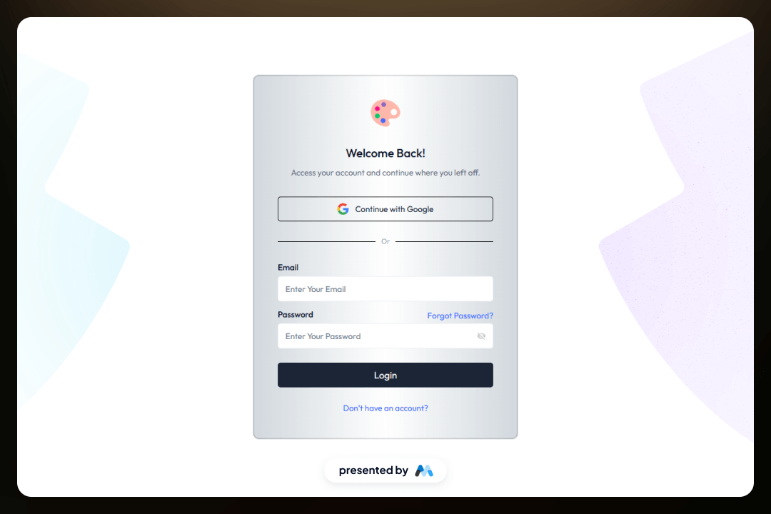 • Email and password input fields for user authentication.Social media login options, including Google integration.Password recovery link for user convenience.Responsive design that adapts to various screen sizes.Success and error messages to inform users of their submission status.