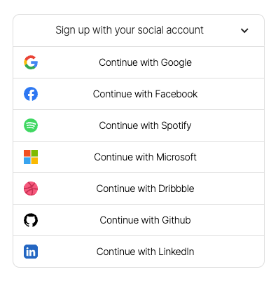 • Supports multiple social login options including Google, Facebook, Spotify, Microsoft, Dribbble, Git