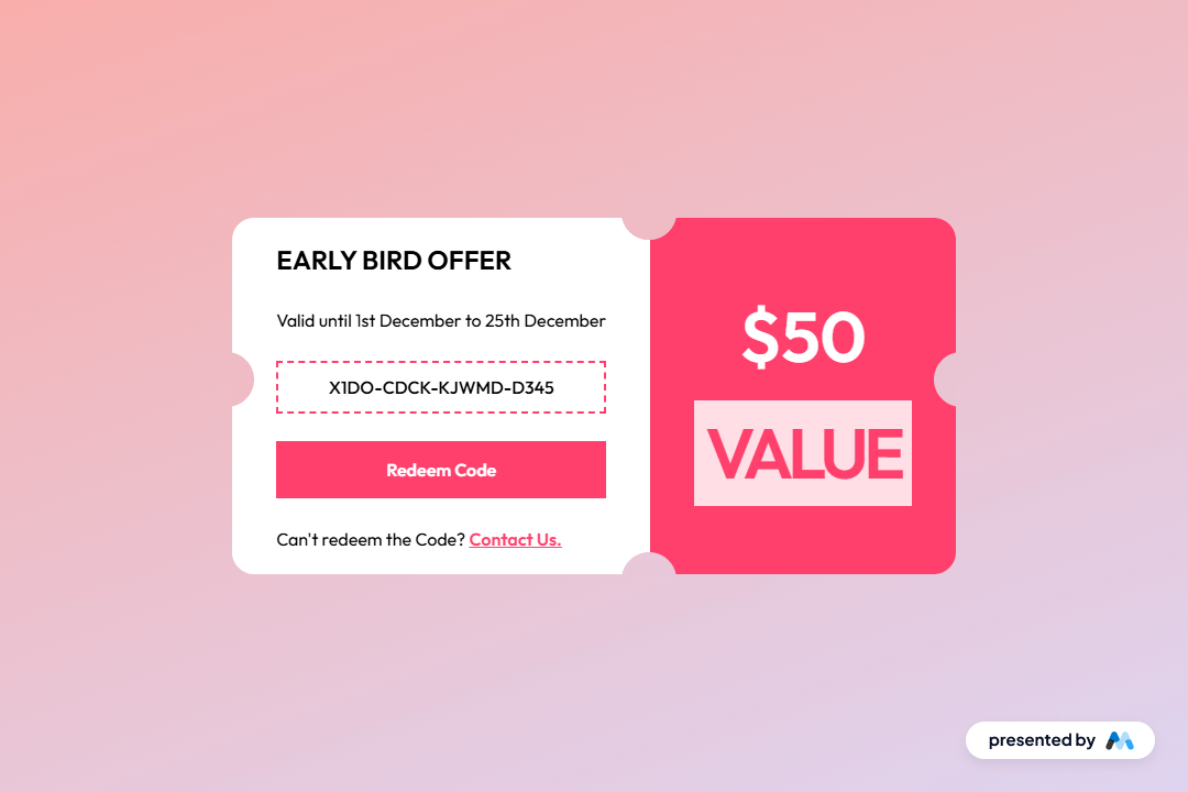 • Prominent display of coupon title (e.g., 'EARLY BIRD OFFER')Clear validity period for the offer (e.g., 'Valid until 1st December to 25th December')Unique coupon code display (e.g., 'X1DO-CDCK-KJWMD-D345')Call-to-action button for redeeming the coupon