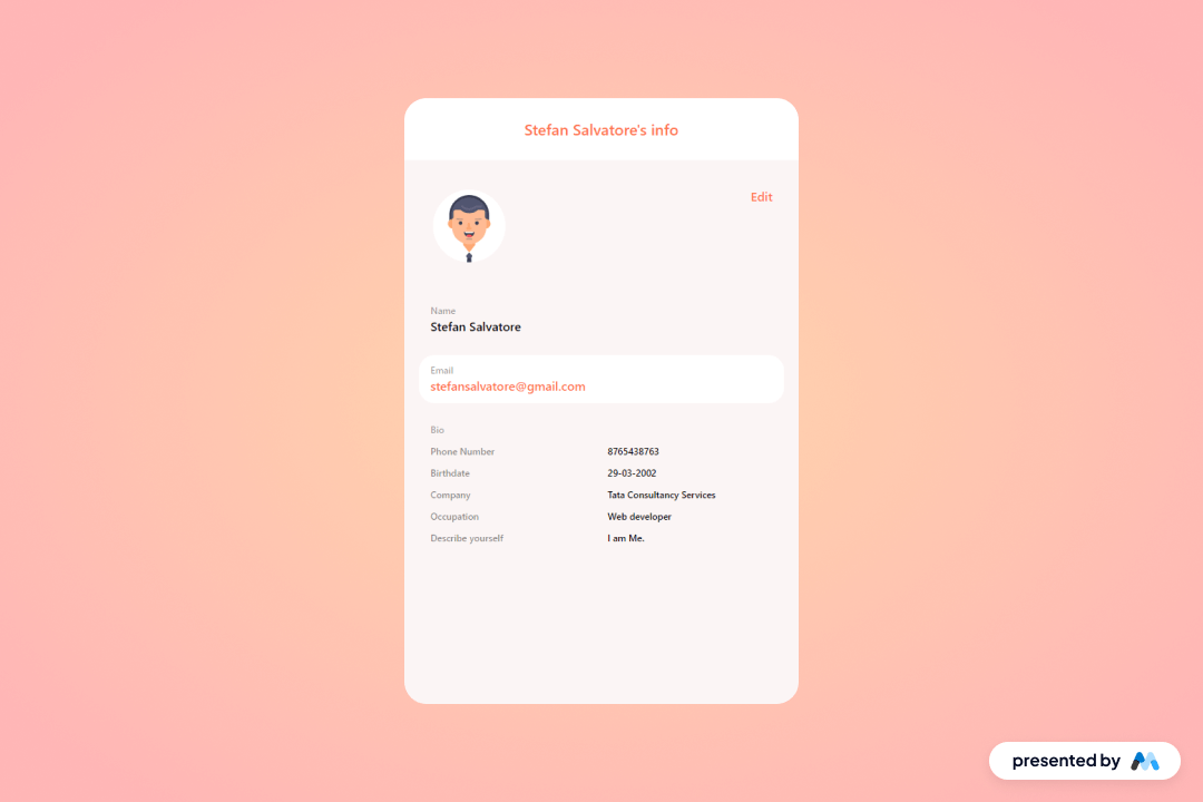 • User information display with sections for name, email, phone number, and bio.Form integration for user input, allowing for updates to profile information.Responsive design that adapts to different screen sizes.Success and error messages for form submissions to enhance user experience.