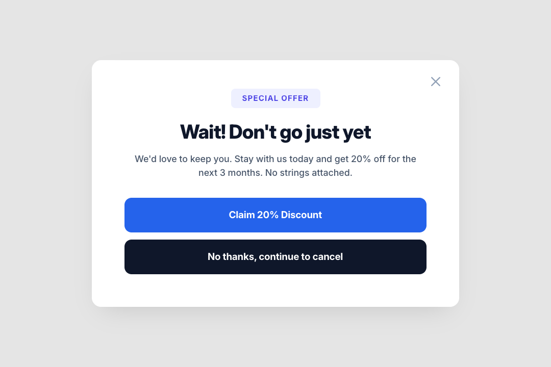 - Intercepts cancel clicks and shows a retention offer before the Stripe Customer Portal