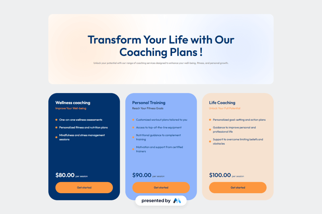 • Multiple coaching plans displayed in a grid format, allowing users to easily compare options.Clear headings and descriptions for each service, enhancing readability.Call-to-action buttons for user engagement, such as 'Get started' for each plan.Responsive design elements that adapt to different screen sizes.