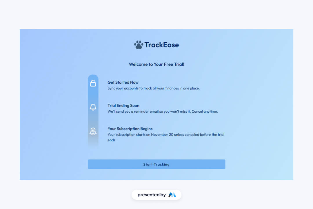 • Ease' and 'Welcome to Your Free Trial!'Call-to-action buttons like 'Start Tracking' and 'Get Started Now' to prompt user interaction.Trial reminder notifications to keep users informed about their subscription status.