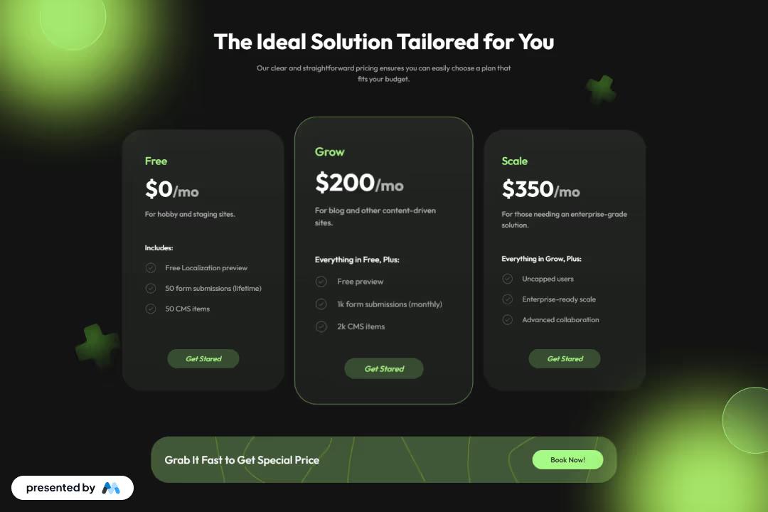 This pricing component offers three distinct plans—Free, Grow, and Scale—designed to meet various business needs with essential features like form submissions and CMS items. It provides a transparent and scalable pricing structure.