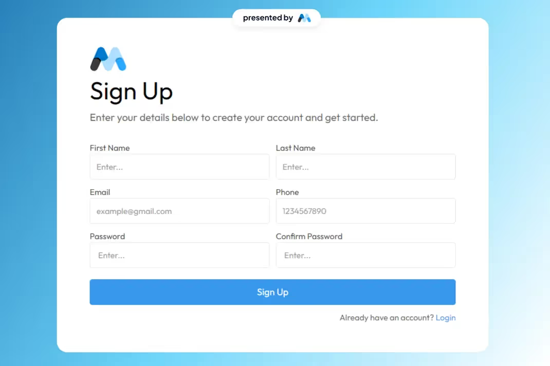 The Individual Signup component is designed to facilitate user registration through a clean and user-friendly interface, incorporating both traditional and social login options. Key Features User-friendly form layout with clear labels Includes fields for name, email, and password Social login options for Google and Facebook Responsive design suitable for various devices Success and error messages for user feedback Design Elements Modern and minimalistic design Color scheme featuring shades of blue and white Rounded input fields and buttons for a softer appearance Use of icons for social login options Potential Use Cases Startups looking to onboard new users quicklyE-commerce platforms requiring user registration SaaS applications needing a streamlined signup process Event management sites for attendee registration Educational platforms for student enrollment Conclusion: The Individual Signup component is a versatile and visually appealing solution for any website needing a registration feature, enhancing user experience and engagement.